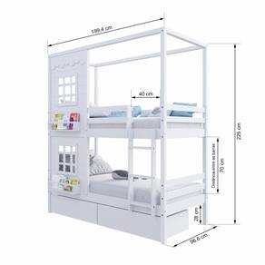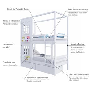 Diferenciais: Escada Fixa, Casinha com fechamento em MDF, 02 Janelas e Prateleira para Livros e Decoração, 02 Gavetas, Montagem Reversível (Lado Direito ou Lado Esquerdo)