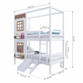 Diferenciais: Escada Fixa, Kit Escada/ Escorregador,, Casinha com fechamento em MDF, 02 Janelas e Prateleira para Livros e Decoração, Montagem Reversível (Lado Direito ou Lado Esquerdo)