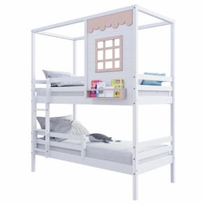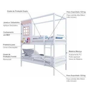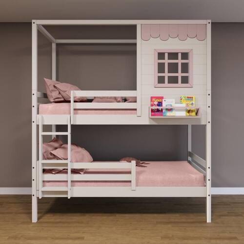 Diferenciais: Escada Fixa, Grade de Proteção Removível, Casinha com fechamento em MDF, Janela e Prateleira para Livros e Decoração, Montagem Reversível (Lado Direito ou Lado Esquerdo)