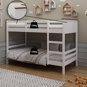 Detalhes do produto: Modelo: BL141 Material: Madeira Maciça de Pinus de Reflorestamento e MDF de 2,2cm de espessura Pintura/Acabamento: Pu Branco /Castanho e UV 30% brilho (deixando aparente os veios da madeira) Para Colchões de Dimensões (cm x cm): 188x88 Colchão: Não incluso Peso Suportado : 120 Kg por cama Acessórios: Escada Fixa Altura entre camas: 81cm