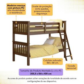 O Beliche de Solteiro Madeira Maciça para Colchão 88 x 188 cm Multimóveis CR35206 é produzido em madeira maciça de pinus com acabamento em pintura PU, combinando alta qualidade, durabilidade e facilidade na limpeza. Além disso, suporta até 80kg na cama superior (possui grades de proteção) e 100kg na cama inferior, garantindo segurança e tranquilidade para as noites de sono. Possui escada móvel (pode ser desmontada do beliche) e NÃO acompanha colchões (tamanho indicado dos colchões: 188 x 88 cm). Com design elegante e funcional, este beliche é a solução perfeita para otimizar o espaço do quarto.