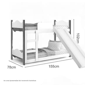 Apresentando a Beliche Encanto! Desperte o encanto no quarto das crianças com a Beliche Encanto. Este beliche combina estilo e funcionalidade, oferecendo um lugar aconchegante para dormir e espaço extra para brincadeiras. Dimensões do Produto Montado: Altura: 102 cm Largura: 78 cm Profundidade: 155 cm Detalhes: - Ideal para: colchões de 68x148 cm (colchões não inclusos) - Escorregador incluso - Design lúdico e divertido - Produto em MDF Informações adicionais: - Verifique o tamanho e os detalhes do produto antes de realizar a compra. - As fotos são meramente ilustrativas. Objetos decorativos que aparecem nas imagens não acompanham o produto. - A transportadora entregará o produto no portão e/ou portaria da residência, ou ainda, somente no andar térreo, em caso de prédios, do endereço de entrega. - Avaliar a mercadoria no ato do recebimento e recusar em caso de divergência ou danos.