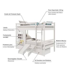 Diferenciais: Escada Fixa, Grade de Proteção Dupla, Janela com fechamento em MDF e Prateleira para Livros e Decoração, 02 Gavetas, kit Escada/ Escorregador.
