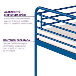 um quarto funcional, moderno e cheio de personalidade. Acabamento dos Pés: Pintura Acompanha Cama Auxiliar: Não Acompanha Colchão: Não Altura do Estrado até o Chão: 33 cm Altura do Estrado Superior até o Chão: 144 cm Altura dos Pés: 33 cm Ambiente Principal: Quarto Infantil codigo_ean: 7900288145871 Complexidade da Montagem: Alta: deve ser montado por um montador especializado Cor: Azul / Álamo Cor do Produto: Azul / Álamo Escala de Brilho: Semi-Fosco Itens Inclusos: 1 beliche, kit ferragens e manual de montagem Linha ou Coleção: Linha Teko Manual de Montagem e Instalação: https://cdn2.madeiramadeira.com.br/prd/sedlak-representacao/2918198-168-9235a300-b87a-4079-acaa-e5aee549ba20-1747050945.pdf Marca: Casatema Material da Escada: Aço/MDF Material do Estrado: MDF Material dos Pés: Aço Material Principal: Aço Necessita Montagem: Sim Número de Camas: 02 Origem do Produto: Nacional Permite a Utilização de Cama Auxiliar: Sim Peso: 80 kg Peso Suportado por cada cama: 80 kg Possui Escrivaninha: Não Possui Espelhos: Não Possui Grade: Sim Possui Pés: 04 Possui Portas: Não Possui Prateleiras: Não Possui Rodízio: Não Recomendações de Uso, Manutenção e Limpeza: Use um pano macio, levemente umedecido com água. Não utilize solventes ou abrasivos.Para garantir estabilidade e durabilidade, é recomendado reapertar os parafusos de tempos em tempos. Sapatas Niveladoras: Não Sistema de Montagem: Parafusos Suporta Até (kg): 160 kg Tamanho da Cama: Solteiro Tamanho do Colchão Indicado (L x C): 88x188cm Tipo de Cama: Beliche Tipo de Colchão: Solteiro Tipo de Estrado: Fixo Trava de Segurança: Não