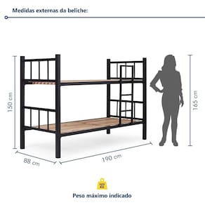 A beliche de solteiro é fácil de montar? Sim, a montagem é simples e prática. Acompanha Cama Auxiliar: Não Acompanha Colchão: Não Altura do Estrado até o Chão: 150 cm Ambiente Principal: Quarto Infantil codigo_ean: 7900288279019 Complexidade da Montagem: Média: pode ser montado por mais de uma pessoa e/ou necessite de maior conhecimento para montagem Cor: Preto Cor do Produto: Preto Escala de Brilho: Super Brilho Itens Inclusos: 1 Beliche, Kit Ferragens e Manual de Montagem Manual de Montagem e Instalação: https://product-hub-prd.madeiramadeira.com.br/728067589/documents/fecab80d-8cba-403a-8f33-1e423ea4fe0c3283373554117610500247928.pdf Marca: Prima Design Material do Estrado: Eucalipto Material Principal: Aço modular: Não Necessita Montagem: Sim Origem do Produto: Nacional Permite a Utilização de Cama Auxiliar: Sim Peso: 41 kg Possui Baú: Não Possui Casinha: Não Possui Estante: Não Possui Gavetas: Não Possui Pés: Não Possui Portas: Não Possui Prateleiras: Não Recomendações de Uso, Manutenção e Limpeza: Para uso de um ocupante por cama. Idade mínima recomendada: 6anos. O colchão deve ser do tamanho correto, sem espaço sobrando na cabeceira ou no pé da cama. Sempre mantenha o beliche em perfeitas condições, principalmente a escada e as ripas do estrado. Sistema de Montagem: Parafusos Suporta Até (kg): 120 kg Tamanho do Colchão Indicado (L x C): 188x78 Tipo de Cama: Beliche Tipo de Colchão: Infantil Tipo de Estrado: Removível Marca: Não Informado
