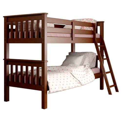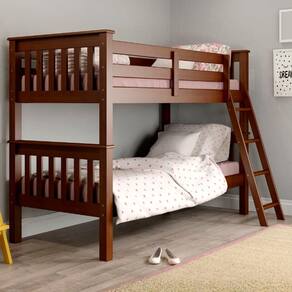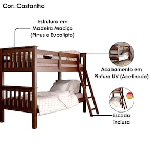 Cama Beliche 721EA imponente e clássica, ideal para compor quartos com elegância! Com estrutura 100% em Madeira Maciça de Pinus (sendo os lastros em Madeira de Eucalipto 2,3 cm) e acabamento UV acetinado. Composta por camas reforçadas, escada com gancho de fixação mantendo-a firme na beliche mas sem ser fixa (podendo ser retirada quando quiser) e pés com espessura de 6,3 cm. O espaçamento entre as camas é de 67 cm, suportando até 80kg na superior e 100kg na inferior, ambas ideais e indicadas para colchões de 188x88 cm. NÃO ACOMPANHA COLCHÃO NEM DEMAIS DECORAÇÕES. Produto será entregue em 3 volumes.