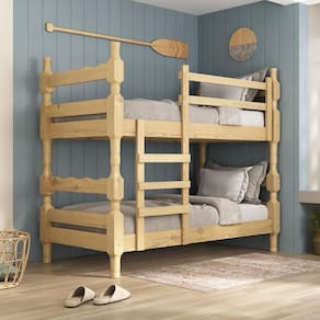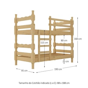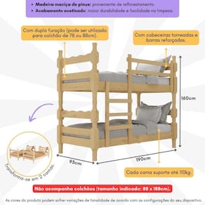 O Beliche Madeira Maciça - vira 2 Camas - para Colchão 78/88 x 188cm Porto Multimóveis é produzido 100% em madeira maciça proveniente de reflorestamento. Com cabeceiras torneadas (espessura de 8,5 x 8,5cm), possui barras reforçadas e suporta até 110kg. Super versátil, você pode utilizá-lo também como duas camas e, para facilitar, possui dupla furação podendo ser utilizado para colchão de 78 ou 88cm. Não acompanha colchões.