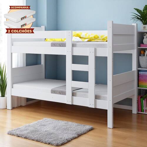 Beliche Resistente Fortaleza em Mdf Vira 2 Camas Solteiro Branco com 2 Colchões - Beliche em MDF com 2 colchões