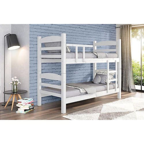 Produto desenvolvido para quartos com pouco espaço, casas e apartamentos, sem perder o estilo. Esta Beliche é produzida em madeira Pínus maciça, conta com acabamento em cores modernas e atuais. Possui os pés com bitola de 6,5x6,5cm e barras com 2cm de espessura. garantindo ótima resistência e alta durabilidade, suportando até 150Kg por leito.