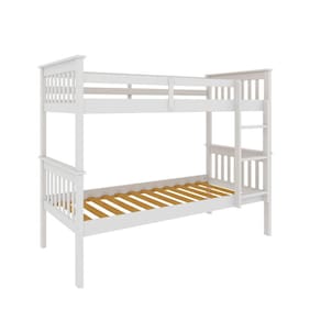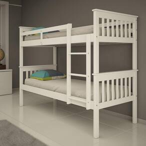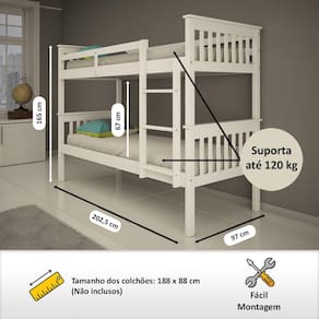 Material: Madeira Maciça de Pinus de Reflorestamento e MDF Pintura/Acabamento: Pu e UV Branco /Castanho Claro (deixando aparente os veios da madeira) Para Colchões de Dimensões (cm x cm): 188x88 Colchão: Não incluso Peso Suportado : 120 Kg por cama Acessórios: Escada Fixa