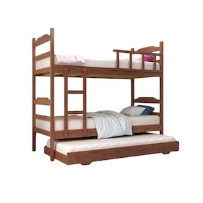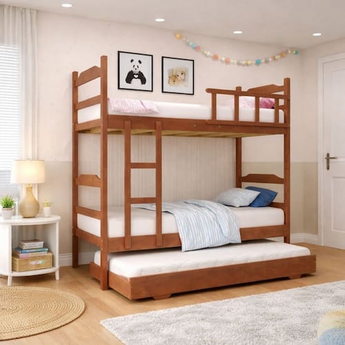Características Principais: - 3 camas de solteiro em 1 móvel: 1 beliche com 2 camas de solteiro + 1 cama auxiliar de solteiro, ideal para quem precisa de mais camas sem ocupar muito espaço. - Estrutura robusta e durável: Fabricada em madeira maciça de eucalipto de reflorestamento garantindo resistência e longa durabilidade. - Design funcional e moderno: Cama auxiliar com rodízios, facilitando a movimentação e o aproveitamento do espaço, e escada fixa para acesso seguro à cama superior. - Acabamento de alta qualidade: verniz acetinado e laca PU fosca. - Segurança e conforto: A cama superior possui grades de proteção para garantir maior segurança. - Capacidade de peso: Cada cama de solteiro e a cama auxiliar suportam até 120 kg. - Otimização de espaço: Perfeita para quartos pequenos ou para quem recebe visitas frequentemente, proporcionando mais camas de forma prática e elegante.