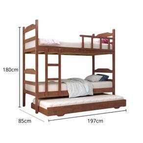 Dimensões: - Treliche com beliche de 2 camas de solteiro: 197 cm (comprimento) x 180 cm (altura) x 85 cm (largura) - Cama auxiliar de solteiro: 190 cm (comprimento) x 85 cm (largura) - Altura entre as camas: 80 cm - Dimensão com cama auxiliar aberta: 180 cm