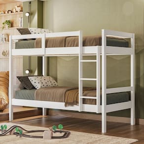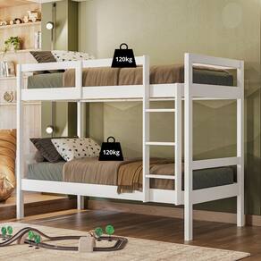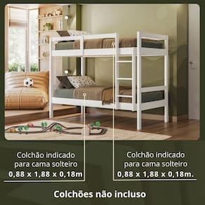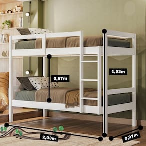 Modelo: BL126 Material: Madeira maciça de Pinus e MDF de 2,2 cm Acabamento: PU Branco ou Castanho com UV 30% brilho Capacidade de peso: 120 kg por cama Acessórios: Escada fixa Altura entre camas: 67 cm