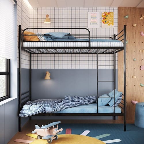 Montagem Simples: Sistema de encaixe prático que você Produto Montado: Sim Acabamento dos Pés: Poliéster Acompanha Cama Auxiliar: Não Acompanha Colchão: Não Altura do Estrado até o Chão: 30 cm Altura do Estrado Superior até o Chão: 30.0000 Altura dos Pés: 30 cm Altura Máxima dos Pés: 30.0000 Ambiente Principal: Quarto codigo_ean: 7900288023261 Complexidade da Montagem: Baixa: pode ser montado por uma pessoa sozinha Comprimento: 201 cm Cor: Preto Cor do Produto: Preto Cor Flex: Não Escala de Brilho: Semi-Fosco Itens Inclusos: 1 Parte Estrutural do Treliche + Estrados em Ferro + Parafusos para o Estrado Linha ou Coleção: Beliche Manual de Montagem e Instalação: https://product-hub-prd.madeiramadeira.com.br/969947/documents/89b0f402-109a-493e-9f88-2f0be3c36b032550332593617313617221997.pdf Marca: Camas e Beliches Material da Escada: Ferro Material dos Pés: Plástico Material Principal: Aço Montagem Flex: NÃO Necessita Montagem: Sim Número de Camas: 02 Origem do Produto: Nacional Permite a Utilização de Cama Auxiliar: Sim Peso: 70 kg Peso Suportado por cada cama: 150.0000 Possui Baú: Não Possui Escrivaninha: Não Possui Espelhos: Não Possui Gavetas: Não Possui Grade: Sim Possui Nichos: Não Possui Pés: 04 Possui Portas: Não Possui Prateleiras: Não Possui Rodízio: Não Recomendações de Uso, Manutenção e Limpeza: Apenas um pano úmido. Não pode deixar molhada. Sapatas Niveladoras: Não Sistema de Montagem: Encaixe Tamanho da Cama: Solteiro Tamanho do Colchão Indicado (L x C): 1.88x88 Tipo de Cama: Beliche Tipo de Colchão: Solteiro Tipo de Estrado: Removível Trava de Segurança: Sim Marca: Camas e Beliches