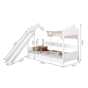 Beliche Solteiro Erika Nuvem Com Escorregador - BrancoA Beliche Solteiro Erika proporciona para o quarto um toque de delicadeza, requinte e conforto. Além de decorar ainda mais o ambiente, ela traz diversão e alta segurança pois é feita em MDF, material resistente e de qualidade.Tipo: Beliche SolteiroModelo: ErikaCor: Branco Garantia: 90 diasProduto DesmontadoMaterial 100% MDFPintura UV Verniz BrilhoNão acompanha colchãoItens inclusos:EscorregadorKit de montagemManual de montagemGrade de proteçãoMedidas:Altura: 124cmLargura: 94cmComprimento: 194cmATENÇÃOIMAGENS MERAMENTE ILUSTRATIVAS REALIZADO EDIÇÃO, PODENDO HAVER UMA PEQUENA VARIAÇÃO DE COR DEPENDENDO DE CADA TELA OU MONITOR.