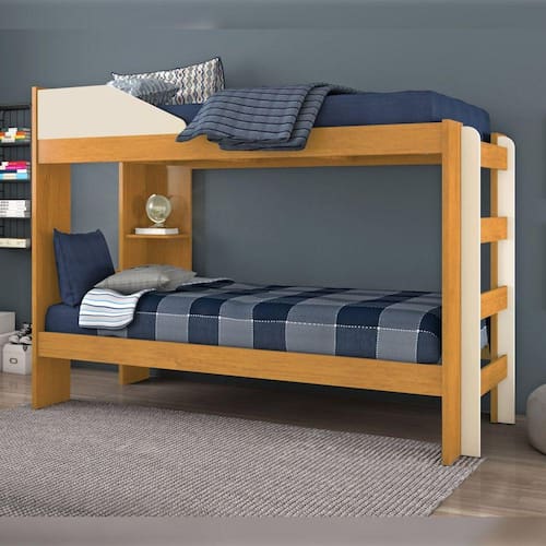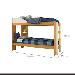 Que tal deixar seu ambiente ainda mais bonito e aconchegante? A Beliche Indy dá um toque todo especial para o seu quarto, com estrutura em MDP e um excelente acabamento de pintura UV. Possui travessas reforçadas, travamento nos pés para maior segurança e proteção anti quedas na cama superior. Conta com escada lateral e prateleira interna para objetos. Pés reforçados de 25 mm garantindo melhor resistência ao móvel. Não acompanha colchão. Acabamento da Prateleira: Pintura Acompanha Cama Auxiliar: Não Acompanha Colchão: Não Altura do Estrado até o Chão: 33,7 cm Ambiente Principal: Quarto codigo_ean: 7909903363737 Complexidade da Montagem: Média: pode ser montado por mais de uma pessoa e/ou necessite de maior conhecimento para montagem Cor: Cinamomo/Off White Cor do Produto: Cinamomo/Off White Escala de Brilho: Fosco Escala de Brilho da Prateleira: Fosco Itens Inclusos: 1 Beliche, Manual de Montagem e Kit Ferragens Linha ou Coleção: Indy Manual de Montagem e Instalação: https://product-hub-prd.madeiramadeira.com.br/858937/documents/7e4084a1-4bf0-4e3e-88c2-018224c638bab0337119013belicheindy2018.pdf Material da Prateleira: MDP Material do Estrado: pinus e eucalipto Material Principal: MDF/MDP Necessita Montagem: Sim Origem do Produto: Nacional Permite a Utilização de Cama Auxiliar: Sim Peso: 63 kg Peso Máximo por Prateleira: 3 kg Possui Baú: Não Possui Gavetas: Não Possui Pés: Não Possui Portas: Não Possui Prateleiras: Sim Recomendações de Uso, Manutenção e Limpeza: Na limpeza, não utilizar produtos químicos e abrasivos. Usar apenas um pano umedecido para garantir a maior durabilidade do móvel. Sistema de Montagem: Parafusos, porcas e pregos Suporta Até (kg): 160 kg Tamanho do Colchão Indicado (L x C): 88cm x 188cm Tipo de Cama: Beliche Tipo de Colchão: Solteiro Tipo de Estrado: Fixo Ean: 7909903363737