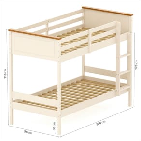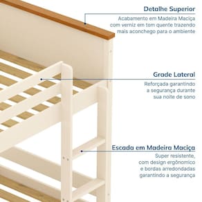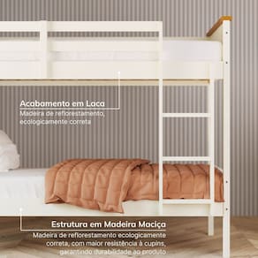 Além disso, nossa cadeia de abastecimento respeita as normas de conformidade e compliance. Trabalhamos apenas com fornecedores que seguem práticas éticas e sustentáveis, garantindo que cada etapa de produção da Linha Ananda está alinhada com padrões ambientais e sociais responsáveis. Acabamento dos Pés: Laca Acompanha Cama Auxiliar: Não Acompanha Colchão: Não Altura do Estrado até o Chão: 31 cm Altura do Estrado Superior até o Chão: 119 cm Altura dos Pés: 38 cm Ambiente Principal: Quarto Complexidade da Montagem: Média: pode ser montado por mais de uma pessoa e/ou necessite de maior conhecimento para montagem Comprimento: 200 cm Cor: Off-white/Mel Cor do Produto: Off-White/Mel Escala de Brilho: Semi-Fosco Itens Inclusos: 1 Beliche, kit ferragens e manual de montagem Manual de Montagem e Instalação: https://product-hub-prd.madeiramadeira.com.br/918170/documents/a174ce19-aeba-477f-bcd7-c8876d7059362081515476017192597774132.pdf Material da Escada: Pinus Material do Estrado: Pinus Material dos Pés: Madeira Maciça Material Principal: Madeira Maciça Necessita Montagem: Sim Número de Camas: 02 Origem do Produto: Nacional Permite a Utilização de Cama Auxiliar: Não Peso: 56,5 kg Peso Suportado por cada cama: 100 kg Possui Baú: Não Possui Escrivaninha: Não Possui Gavetas: Não Possui Grade: Sim Possui Nichos: Não Possui Pés: 04 Possui Portas: Não Possui Prateleiras: Não Possui Rodízio: Não Recomendações de Uso, Manutenção e Limpeza: Pano levemente umedecido, não usar produtos químicos ou abrasivos Sapatas Niveladoras: Não Sistema de Montagem: Parafusos, cavilha, haste, suporte, feltro adesivo Tamanho da Cama: Solteiro Tamanho do Colchão Indicado (L x C): 88cm x 188cm Tipo de Cama: Beliche Tipo de Colchão: Solteiro Tipo de Estrado: Fixo Tipo de Madeira Maciça: Pinus Tipo de Madeira Maciça dos Pés: Pinus Trava de Segurança: Sim