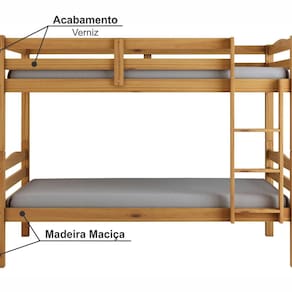 Ótima escolha para casas e apartamentos – Perfeito para otimizar espaços sem perder o estilo. Produto Montado: Sim Acabamento dos Pés: Verniz Acompanha Cama Auxiliar: Não Acompanha Colchão: Não Altura do Estrado até o Chão: 34 cm Altura do Estrado Superior até o Chão: 116.0000 Altura dos Pés: 74 cm Altura Máxima dos Pés: 74.0000 Ambiente Principal: Quarto codigo_ean: 7900288091628 Complexidade da Montagem: Baixa: pode ser montado por uma pessoa sozinha Cor: Mel Cor do Produto: Mel Escala de Brilho: Semi-Brilho Informações Complementares: Os objetos que ambientam as fotos não acompanham o produto. Imagens meramente ilustrativas. Cores e tonalidades podem variar. Itens Inclusos: 1 Beliche, Kit Ferragem e Manual de Montagem Linha ou Coleção: Madiz Manual de Montagem e Instalação: https://product-hub-prd.madeiramadeira.com.br/981653/documents/60b63f50-aa64-42a8-8e6b-b58a3e57f7e62748131501317422482195724.pdf Marca: Arbol Móveis Material do Estrado: Pinus Material dos Pés: Madeira Maciça Material Principal: Madeira Maciça Necessita Montagem: Sim Número de Camas: 02 Origem do Produto: Nacional Permite a Utilização de Cama Auxiliar: Sim Peso: 57 kg Peso Suportado por cada cama: 100.0000 Possui Baú: Não Possui Escrivaninha: Não Possui Espelhos: Não Possui Gavetas: Não Possui Nichos: Não Possui Pés: 04 Possui Portas: Não Possui Prateleiras: Não Possui Rodízio: Não Recomendações de Uso, Manutenção e Limpeza: Não armazenar ou utilizar o produto em locais com excesso de umidade. Para limpeza, não utilizar produtos químicos e abrasivos, usar apenas com pano umedecido, para garantir a maior durabilidade do móvel. Seguir rigorosamente as instruções de uso contidas no Manual de Montagem. Sapatas Niveladoras: Não Sistema de Montagem: Cavilhas, minifix e parafusos Tamanho da Cama: Solteiro Tamanho do Colchão Indicado (L x C): 88cm x 188cm Tipo de Cama: Beliche Tipo de Colchão: Solteiro Tipo de Estrado: Fixo Tipo de Madeira Maciça: Pinus Tipo de Madeira Maciça dos Pés: Pinus Trava de Segurança: Sim Marca: Arbol Móveis