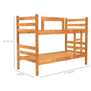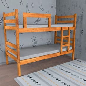 Caracteristicas: Marca: Meneghetti Modelo: 65480 Tipo: Beliche Tamanho do colchão: 88x188 cm Peso máximo suportado: 120 kg Cama auxiliar: Não Material da estrutura: Madeira de eucalipto maciça Acabamento: Pintura cera mel Observações: Produto não acompanha colchão