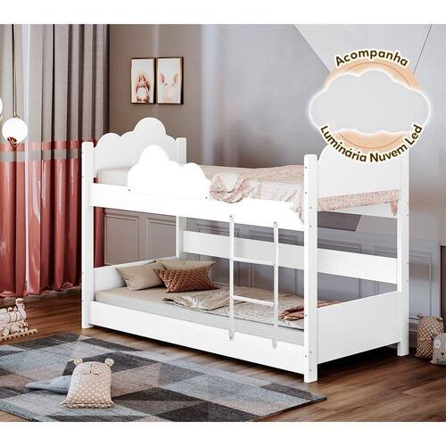 Beliche Solteiro Montessoriana Nuvem Erika Branco Acompanha Luminária Led - Cor: Branco Beliche Solteiro Montessoriana Nuvem Erika - BrancoA Beliche Solteiro Erika proporciona para o quarto um toque de delicadeza, requinte e conforto. Além de decorar ainda mais o ambiente, ela traz diversão e alta segurança pois é feita em MDF, material resistente e de qualidade.Tipo: Beliche SolteiroModelo: ErikaCor: Branco Garantia: 90 diasProduto DesmontadoMaterial 100% MDFPés em madeira maciçaPintura UV Verniz BrilhoNão acompanha colchãoItens inclusos:Kit de montagemManual de montagemGrade de proteçãoMedidas:Altura: 124cmLargura: 94cmComprimento: 194cmATENÇÃOIMAGENS MERAMENTE ILUSTRATIVAS REALIZADO EDIÇÃO, PODENDO HAVER UMA PEQUENA VARIAÇÃO DE COR DEPENDENDO DE CADA TELA OU MONITOR.Beliche Solteiro Montessoriana Nuvem Erika Branco Acompanha LuminÃria Led Marca: Baby Mobilia