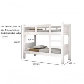 A beliche Vitamov Porto solteiro foi desenvolvida para acomodar duas camas com praticidade em ambientes compactos. Com estrutura 100% em madeira e proteção lateral, oferece mais no uso diário, especialmente para a cama superior. As grades de proteção reforçadas e os pés robustos de 7,5 x 7,5 cm contribuem para maior estabilidade e tranquilidade ao dormir. Acompanha dois colchões D-23 no tamanho 88 x 188 cm, garantindo compatibilidade imediata com a estrutura. Seu design em cor branca combina facilmente com diferentes estilos de quarto infantil, juvenil ou de hóspedes.