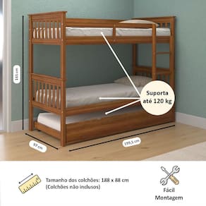 A Treliche Solteiro é ideal para quartos compactos que precisam de móveis que não ocupam muito espaço. Feita para quem deseja acomodar seus amigos e parentes com mais conforto. Conta com 3 camas, cada uma podendo suportar até 120 Kg. Para quem for dormir na parte superior da cama, conta com grades de proteção, fornecendo muito mais segurança.