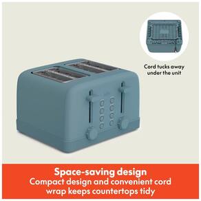 Torradeira com 4 fatias, 6 níveis de tostagem, funções aquecer, cancelar e descongelar. Guias autocentrantes e alavanca de elevação alta. Bandeja de migalhas removível e sistema para enrolar o cabo.Permite ejeção manual