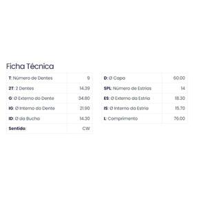 Bendix impulsor de partida bzm 1699 valtra - Bendix impulsor de partida Codigo: Bzm 99.1699.0 Zen 1699 Ficha técnica: T: número de dentes 9 2t: 2 dentes 14.39 G: externo do dente 34.80 Ig: interno do dente 21.90 Id: da bucha 14.30 Sentido: cw D: capa 60.00 Spl: número de estrias 14 Es: externo da estria 18.30 Is: interno da estria 15.70 L: comprimento 76.00 Aplicações: Valtra 685 685ats Iskra 16911403 Motor Iskra 11131598, 11131974, 11132051, aze4148, aze4211, aze4222, is1165 Valtra 221561, 83645200 Conteúdo da embalagem: 1 - bendix impulsor de partida bzm 1699 valtra Características gerais do produto: Marca: bzm Dentes: 9 Sentido de rotação: horário Modelo produto: bzm 99.1699.0 Acompanha o produto: 1- bendix impulsor de partida bzm 1699 valtra : Sem Marca: Não Informado