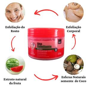 renovação celular: os grânulos finos e naturais de semente de coco e minerais vulcânicos removem delicadamente as células mortas da pele, revelando uma pele fresca e renovada. Pele macia e uniforme: com extrato natural da fruta, melhora a elasticidade da pele e auxilia na uniformização da pele escurecida deixando-a macia e iluminada. Aroma revigorante: experimente o perfume doce e revigorante da melancia, transformando sua rotina de cuidados em uma experiência sensorial. Tratamento facial e corporal: formulado para uso facial e corporal, este esfoliante ajuda a limpar os poros, prevenindo imperfeições e deixando a pele mais macia. Anvisa processo: 25351. 686798/202319 aut/ ms 201236-1