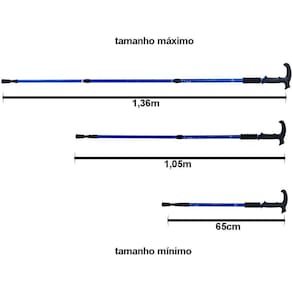 - marca: Campsor - cabo anatômico em nylon e corpo em alumínio - Ponteira com pé em borracha anti-derrapante - Resistente e flexível - Diversos Níveis de regulagem de altura - Altura Miníma retraída: 65 cm - Altura Máxima alongada: 136 cm - Peso suportado: 120 kg - Muito confortável de segurar - Mecanismo mola antichoque reduz tensões nas mãos e pulso - Correia de pulso ajustável, fornecendo um aperto mais seguro - Virola de borracha removível, protege o bastão das caminhadas