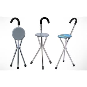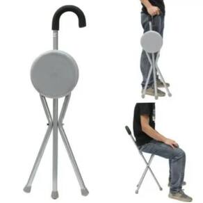 Assento dobrável, permitindo uso como bengala ou banco de apoio.