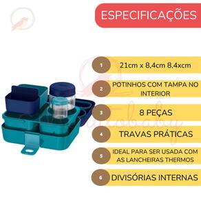 • Material: Plástico de alta qualidade (livre de BPA) • Dimensões: 21cm x 14cm x 5cm • Conteúdo do Conjunto: 1 lancheira, 1 pote de comida (227g), 2 divisores de armazenamento, 1 pote de condimento (57g) com tampa de encaixe. • Limpeza: Lavável na lava-louças • Compatibilidade: Ideal para uso com lancheiras maleáveis Thermos (vendidas separadamente)