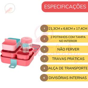 Conteúdo do Conjunto: 1 lancheira, 1 pote de comida (227g), 2 divisores de armazenamento, 1 pote de condimento (57g) com tampa de encaixe.
