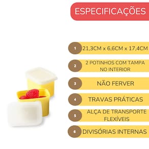 Diferenciais que Fazem a Diferença: Livre de BPA: Segurança em primeiro lugar. Nossos materiais são livres de BPA, garantindo a saúde e bem-estar do seu filho. Alça de Transporte Flexível: Fácil de carregar, perfeita para as pequenas mãos das crianças. Design Moderno e Atraente: A linha Spark Style encanta com cores vibrantes e um design que os pequenos adoram. Ficha Técnica: Idade Indicativa: +3 anos Vedação Segura: Sim Fechos: Fáceis de abrir e fechar Bandeja Interna Removível: Sim Alça de Transporte Flexível: Sim Lavável na Lava-Louças: Sim (somente na parte superior) Livre de BPA: Sim Medidas: 21,33cm x 6,65cm x 17,42cm Instruções de Limpeza e Manutenção: Lancheira, Bandeja e Recipientes Bento: Laváveis na prateleira superior da lava-louças. Micro-ondas: Não pode ser usada no micro-ondas. Fervura: Não ferva a lancheira. Anel de Silicone: Removível para limpeza.