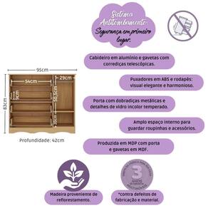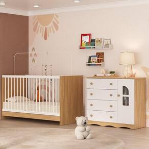 Diferenciais: - 3 anos de garantia contra defeitos de fabricação e material (exceto colchão). - Conjunto produzido em madeira de reflorestamento (MDP 12/15mm) com acabamento acetinado (cerca de 20% de brilho): sustentabilidade e durabilidade. - Berço 3 em 1 que se transforma em sofá e minicama, acompanhando o crescimento do bebê. - Grade fixa palito produzida em madeira de pinus revestida. - Lastro em madeira com 3 regulagens de altura e suporte para mosquiteiro para noites mais tranquilas e protegidas. - Berço certificado pelo INMETRO (Selo n 000332/2025). - Colchão D18 incluso: possui tratamento antiácaro, antialérgico, antimofo e um dos lados impermeável. - Cômoda com 1 porta, 4 gavetas (frontais em MDF) e rodapé usinado: amplo espaço interno e elegância. - Sistema antitombamento na cômoda: proporciona segurança para o bebê e tranquilidade aos pais. - Porta com detalhes de vidro incolor temperado (3mm): toque charmoso que permite visualizar o interior do móvel. - Corrediças telescópicas: abertura total e silenciosa das gavetas. - Cabideiro de alumínio: permite acomodar as roupinhas para que não amassem. - Puxadores em ABS delicados e práticos.