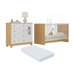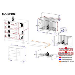 Dimensões do Produto Montado: Berço - Altura: 80,5cm | Largura: 133cm | Profundidade: 66cm Colchão - Altura: 10cm | Largura: 130cm | Profundidade: 60cm Cômoda - Altura: 88cm | Largura: 95cm | Profundidade: 42cm *Você pode consultar as medidas detalhadas na imagem técnica do produto.
