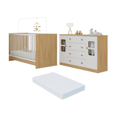 Diferenciais: - 3 anos de garantia contra defeitos de fabricação e material (exceto colchão). - Conjunto produzido em madeira de reflorestamento (MDP 12/15mm) com acabamento acetinado (cerca de 20% de brilho): sustentabilidade e durabilidade. - Berço 3 em 1 que se transforma em sofá e minicama, acompanhando o crescimento do bebê. - Grade fixa palito produzida em madeira de pinus revestida. - Lastro em madeira com 3 regulagens de altura e suporte para mosquiteiro para noites mais tranquilas e protegidas. - Berço certificado pelo INMETRO (Selo n 000332/2025). - Colchão D18 incluso: possui tratamento antiácaro, antialérgico, antimofo e um dos lados impermeável. - Cômoda com 2 portas, 4 gavetas (frontais em MDF) e rodapé: amplo espaço interno e elegância. - Sistema antitombamento na cômoda: proporciona segurança para o bebê e tranquilidade aos pais. - Portas com detalhes de vidro incolor temperado (3mm): toque charmoso que permite visualizar o interior do móvel. - Corrediças telescópicas: abertura total e silenciosa das gavetas. - Cabideiro de alumínio: permite acomodar as roupinhas para que não amassem. - Puxadores em ABS delicados e práticos.