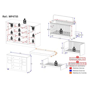 Dimensões do Produto Montado: Berço - Altura: 80,5cm | Largura: 133cm | Profundidade: 66cm Colchão - Altura: 10cm | Largura: 130cm | Profundidade: 60cm Cômoda - Altura: 83cm | Largura: 125cm | Profundidade: 42cm *Você pode consultar as medidas detalhadas na imagem técnica do produto.