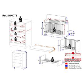 Dimensões do Produto Montado: Berço - Altura: 80,5cm | Largura: 133cm | Profundidade: 66cm Colchão - Altura: 10cm | Largura: 130cm | Profundidade: 60cm Cômoda - Altura: 88cm | Largura: 65cm | Profundidade: 42cm *Você pode consultar as medidas detalhadas na imagem técnica do produto.
