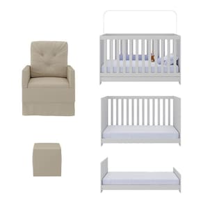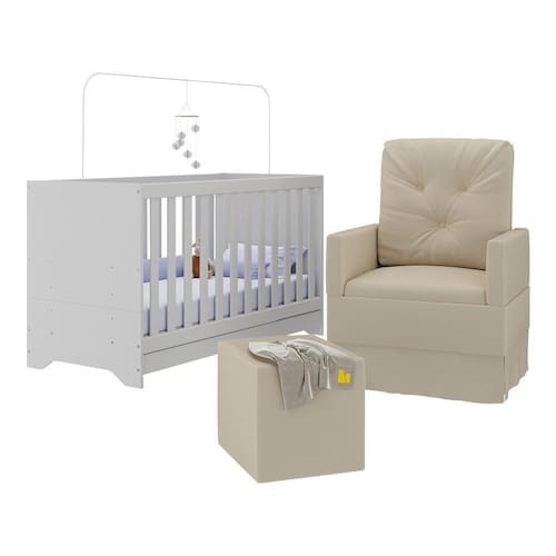 O Berço 3 em 1 com Colchão Poltrona Amamentação e Puff Multimóveis MP4160 é perfeito para proporcionar conforto ao seu pequeno. O berço é produzido em MDP com acabamento acetinado (cerca de 20% de brilho), garantindo durabilidade e resistência. Ele se transforma em sofá e minicama, acompanhando o crescimento do seu filho, possui 3 regulagens de altura para o colchão e acompanha suporte para mosquiteiro, garantindo noites mais tranquilas de sono para o bebê. A grade Soft (PVC) é produzida de maneira ecologicamente correta, com matéria-prima livre de metais pesados, atóxica e com proteção anti-amarelamento. Berço certificado pelo INMETRO sob o selo n 0000085/2018. O colchão possui estrutura em espuma e tecido poliéster e um dos lados é impermeável. De conforto macio, possui tratamento anti-ácaro e anti-alérgico e é indicado para até 50kg. A poltrona de amamentação e o puff (suportam até 110kg) são produzidos em madeira de eucalipto, espuma densidade D23, molas reforçadas e mecanismo de balanço. As poltronas e puff nas cores cinza e bege possuem acabamento em tecido veludo. Poltrona e puff na cor branca possui acabamento em material sintético.