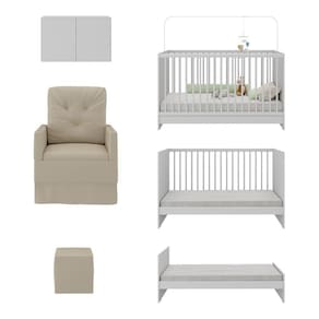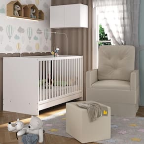 O Berço 3 em 1 com Colchão Poltrona Puff e Armário Aéreo 2 Portas Multimóveis MP4157 é perfeito para proporcionar conforto ao seu pequeno. O berço e o armário aéreo são produzidos em MDP com acabamento acetinado (cerca de 20% de brilho), garantindo durabilidade e resistência. O berço é padrão nacional (tamanho do colchão 1,30 x 0,60), se transforma em sofá e minicama, acompanhando o crescimento do seu filho, possui 3 regulagens de altura para o colchão e acompanha suporte para mosquiteiro, garantindo noites mais tranquilas de sono para o bebê. As grades em MDF/madeira maciça de pinus garantem maior estabilidade e segurança para o bebê. Selo de certificação do INMETRO: 0000085/2018. Acompanha colchão (suporta até 50kg) em espuma revestido com tecido poliéster, que possui conforto macio e tratamento anti-ácaro e anti-alérgico. A poltrona de amamentação e o puff (suportam até 110kg) são produzidos em madeira de eucalipto, espuma densidade D23, molas reforçadas e mecanismo de balanço. As poltronas e puff nas cores cinza e bege possuem acabamento em tecido veludo. Poltrona e puff na cor branca possuem acabamento em material sintético. O armário aéreo possui 2 portas e suporta até 6kg em seu interior.