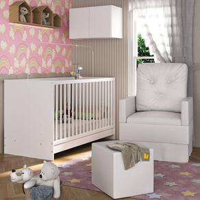 O Berço 3 em 1 com Colchão Poltrona Puff e Armário Aéreo 2 Portas Multimóveis MP4157 é perfeito para proporcionar conforto ao seu pequeno. O berço e o armário aéreo são produzidos em MDP com acabamento acetinado (cerca de 20% de brilho), garantindo durabilidade e resistência. O berço é padrão nacional (tamanho do colchão 1,30 x 0,60), se transforma em sofá e minicama, acompanhando o crescimento do seu filho, possui 3 regulagens de altura para o colchão e acompanha suporte para mosquiteiro, garantindo noites mais tranquilas de sono para o bebê. As grades em MDF/madeira maciça de pinus garantem maior estabilidade e segurança para o bebê. Selo de certificação do INMETRO: 0000085/2018. Acompanha colchão (suporta até 50kg) em espuma revestido com tecido poliéster, que possui conforto macio e tratamento anti-ácaro e anti-alérgico. A poltrona de amamentação e o puff (suportam até 110kg) são produzidos em madeira de eucalipto, espuma densidade D23, molas reforçadas e mecanismo de balanço. As poltronas e puff nas cores cinza e bege possuem acabamento em tecido veludo. Poltrona e puff na cor branca possuem acabamento em material sintético. O armário aéreo possui 2 portas e suporta até 6kg em seu interior.