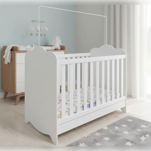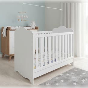 10x70x130 cm, encaixa perfeitamente no berço, oferecendo suporte adequado para crianças de até 3 anos e até 30 kg. O acabamento branco estampado garante durabilidade e visual delicado.