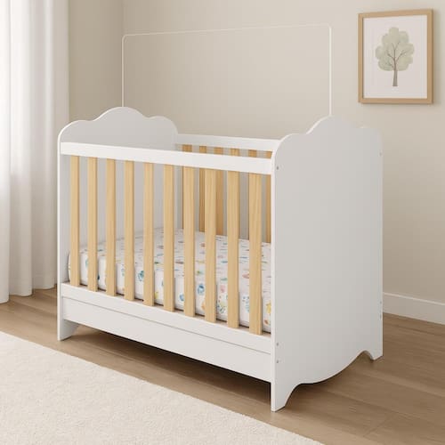 10x70x130 cm, encaixa perfeitamente no berço, oferecendo suporte adequado para crianças de até 3 anos e até 30 kg. O acabamento branco estampado garante durabilidade e visual delicado.