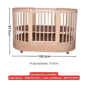 * Produto 3 em 1: miniberço, berço e minicama. * Inclui 2 colchões Ortobom D18 (um para miniberço e outro para berço/minicama). * Estrutura resistente em MDF e madeira maciça de eucalipto. * Acabamento em pintura UV: maior proteção e durabilidade. * 3 regulagens de altura do colchão, adaptando-se ao crescimento do bebê. * Rodízios em silicone gel: fácil movimentação sem danificar o piso. * Certificado pelo INMETRO (Selo n 002114/2018), garantindo segurança e qualidade. * Suporta até 35kg.