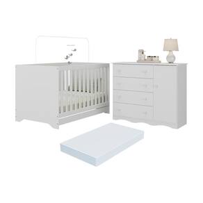 Diferenciais: - 3 anos de garantia contra defeitos de fabricação e material (exceto colchão). - Conjunto produzido em madeira de reflorestamento (MDP 12/15mm) com acabamento acetinado (cerca de 20% de brilho): sustentabilidade e durabilidade. - Berço americano 3 em 1 que se transforma em sofá e minicama, acompanhando o crescimento do bebê. - Grade Soft (PVC): ecologicamente correta, com matéria-prima livre de metais pesados, atóxica e com proteção antiamarelamento. - Lastro em madeira com 3 regulagens de altura e suporte para mosquiteiro para noites mais tranquilas e protegidas. - Berço certificado pelo INMETRO (Selo n 000085/2018). - Colchão D18 incluso: possui tratamento antiácaro, antialérgico, antimofo e um dos lados impermeável. - Cômoda com 1 porta, 4 gavetas e rodapé usinado: amplo espaço interno e elegância. - Sistema antitombamento na cômoda: proporciona segurança para o bebê e tranquilidade aos pais. - Corrediças telescópicas: abertura total e silenciosa das gavetas. - Cabideiro de alumínio: permite acomodar as roupinhas para que não amassem. - Puxadores em ABS delicados e práticos.