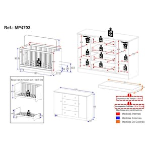Dimensões do Produto Montado: Berço - Altura: 80,5cm | Largura: 133cm | Profundidade: 77,5cm Colchão - Altura: 10cm | Largura: 130cm | Profundidade: 70cm Cômoda - Altura: 83cm | Largura: 125cm | Profundidade: 42cm *Você pode consultar as medidas detalhadas na imagem técnica do produto.