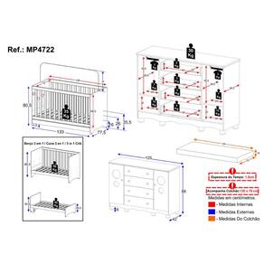Dimensões do Produto Montado: Berço - Altura: 80,5cm | Largura: 133cm | Profundidade: 77,5cm Colchão - Altura: 10cm | Largura: 130cm | Profundidade: 70cm Cômoda - Altura: 88cm | Largura: 125cm | Profundidade: 42cm *Você pode consultar as medidas detalhadas na imagem técnica do produto.