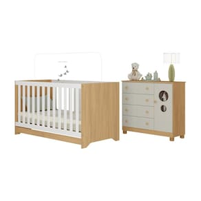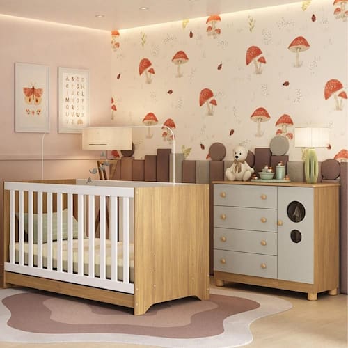 Diferenciais: - 3 anos de garantia contra defeitos de fabricação e material. - Conjunto produzido em madeira de reflorestamento (MDP 12/15mm) com acabamento acetinado (cerca de 20% de brilho): sustentabilidade e durabilidade. - Berço 3 em 1 que se transforma em sofá e minicama, acompanhando o crescimento do bebê. Grade Soft (PVC): ecologicamente correta, com matéria-prima livre de metais pesados, atóxica e com proteção antiamarelamento. - Lastro em madeira com 3 regulagens de altura e suporte para mosquiteiro para noites mais tranquilas e protegidas. - Berço certificado pelo INMETRO (Selo n 000085/2018). - Padrão americano (tamanho do colchão indicado: 130x70cm). Colchão não incluso. - Cômoda com 1 porta, 4 gavetas (frontais em MDF) e pés em polipropileno: amplo espaço interno e elegância. - Sistema antitombamento na cômoda: proporciona segurança para o bebê e tranquilidade aos pais. - Porta com detalhes de vidro incolor temperado (3mm): toque charmoso que permite visualizar o interior do móvel. - Corrediças telescópicas: abertura total e silenciosa das gavetas. - Cabideiro de alumínio: permite acomodar as roupinhas para que não amassem. - Puxadores em ABS delicados e práticos.