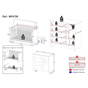 Dimensões do Produto Montado: Berço - Altura: 80,5cm | Largura: 133cm | Profundidade: 77,5cm Cômoda - Altura: 88cm | Largura: 95cm | Profundidade: 42cm *Você pode consultar as medidas detalhadas na imagem técnica do produto.